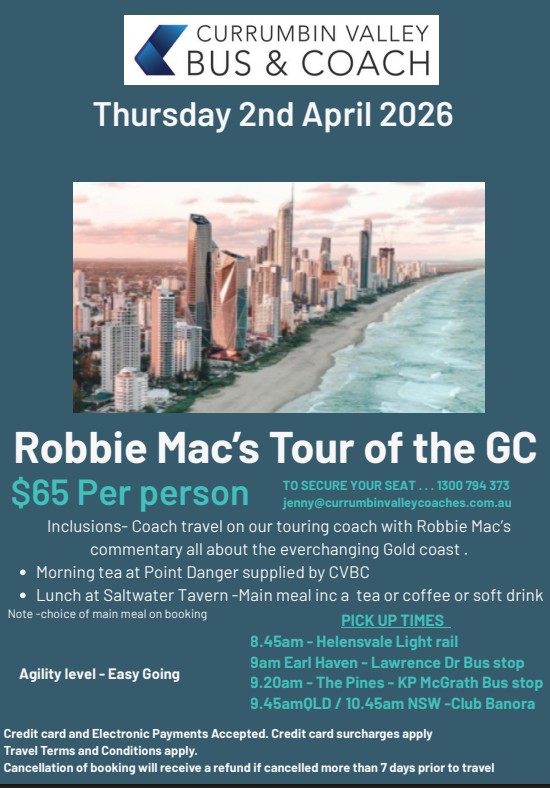 - Coach travel on our touring coach with Robbie Mac’s commentary all about the everchanging Gold coast.